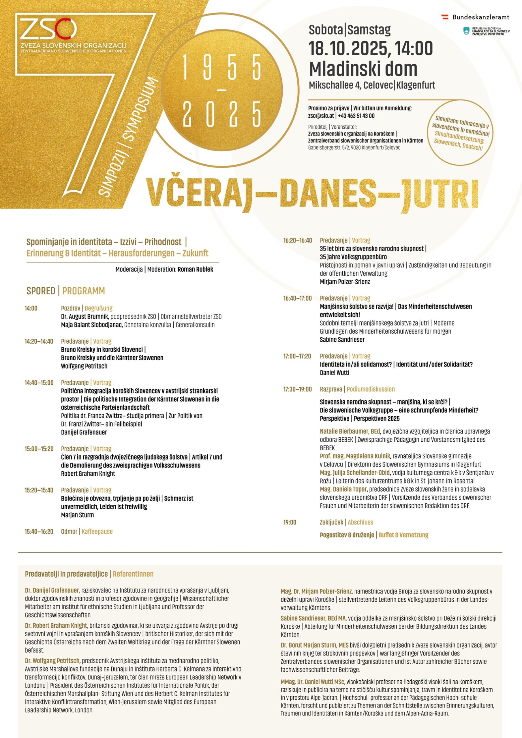 V soboto, 18. oktobra 2025, je dr. Danijel Grafenauer na simpoziju Spominjanje in identiteta – Izzivi – Prihodnost v Celovcu nastopil z referatom Politična integracija koroških Slovencev v avstrijski strankarski prostor – Politika dr. Franca Zwittra – študija primera. 📚